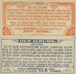 In 1886 the Goodwin & Company issued their first insert baseball cards; these were the N167 portrait cards of New York National League baseball players into their Old Judge brand cigarette packs. From 1887 to 1890 the sepia photo-type N172 card was issued, they became the largest issue of cards ever. This pack also carried the coupon for the N173 cabinet and the coupon for the colorful albums.