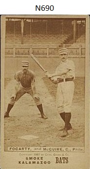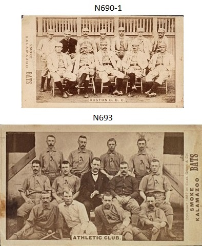 The Charles Gross & Company inserted the N690 and N690-1 cards in their Kalamazoo Bats Box from 1886 to 1888. In 1887 the N693 Kalamazoo Bats Team Cards were made available but there is no cogent evidence as to how they were distributed. There are only six unnumbered cards listed in the N693 Team Set.