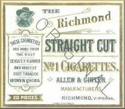 The practice of insert cards all but stopped when competition ended. In January of 1890, Buck Duke chartered the American Tobacco Company in New Jersey. With his vast competitive advantage, coupled with slashing prices and greatly expanding advertising spending, Duke captured 40% of the cigarette market and threatened to bankrupt his competitors. One by one they succumbed to acquisition. When the war ended, all the principle tobacco companies united with Duke in order to survive and became its' founding members. The five constituent companies of the new American Tobacco Company: W. Duke & Sons, Allen & Ginter, W.S. Kimball, Kinney Tobacco, and Goodwin produced 90% of the cigarettes made in 1890, the first year the American Tobacco Company was listed on the NYSE. Shortly after the consolidation, ATC successfully negociated a new contract with the Bonsack Machine Company for the exclusive use and control of the Bonsack cigarette-rolling machine in the United States.